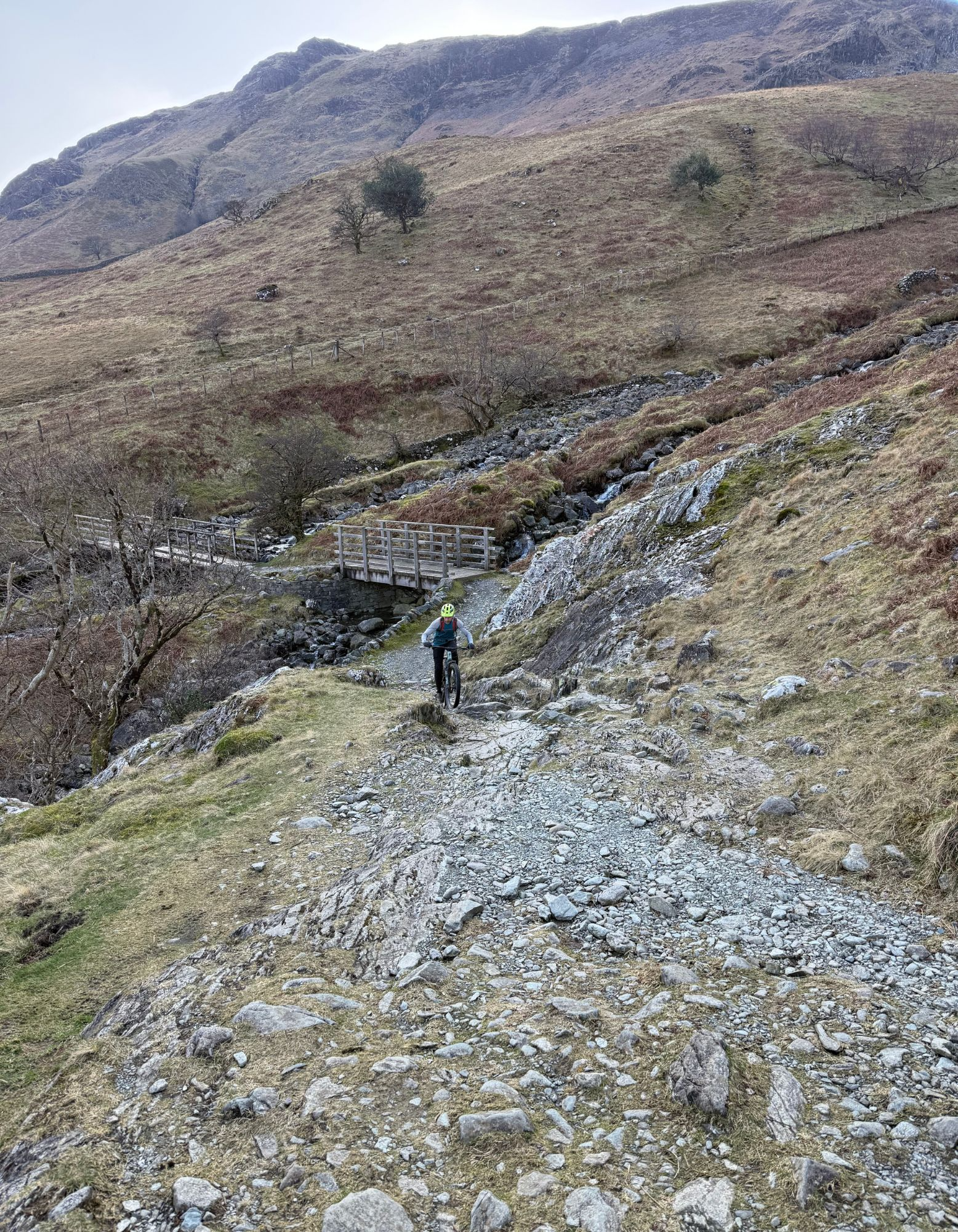 This puts you onto a short climb, but consider that as loading up a fabulous natural roller coaster that swoops, pops and swerves you along the left side of Borrowdale in the blissful flow state that makes riding in the Lakes so legendary. Tech sections up and down mini crags, bridges over dazzling mountain streams, stunning feels looming above you on the left. This section has it all and the ride ability is a really nice relaxing change after the horrors of Honister.