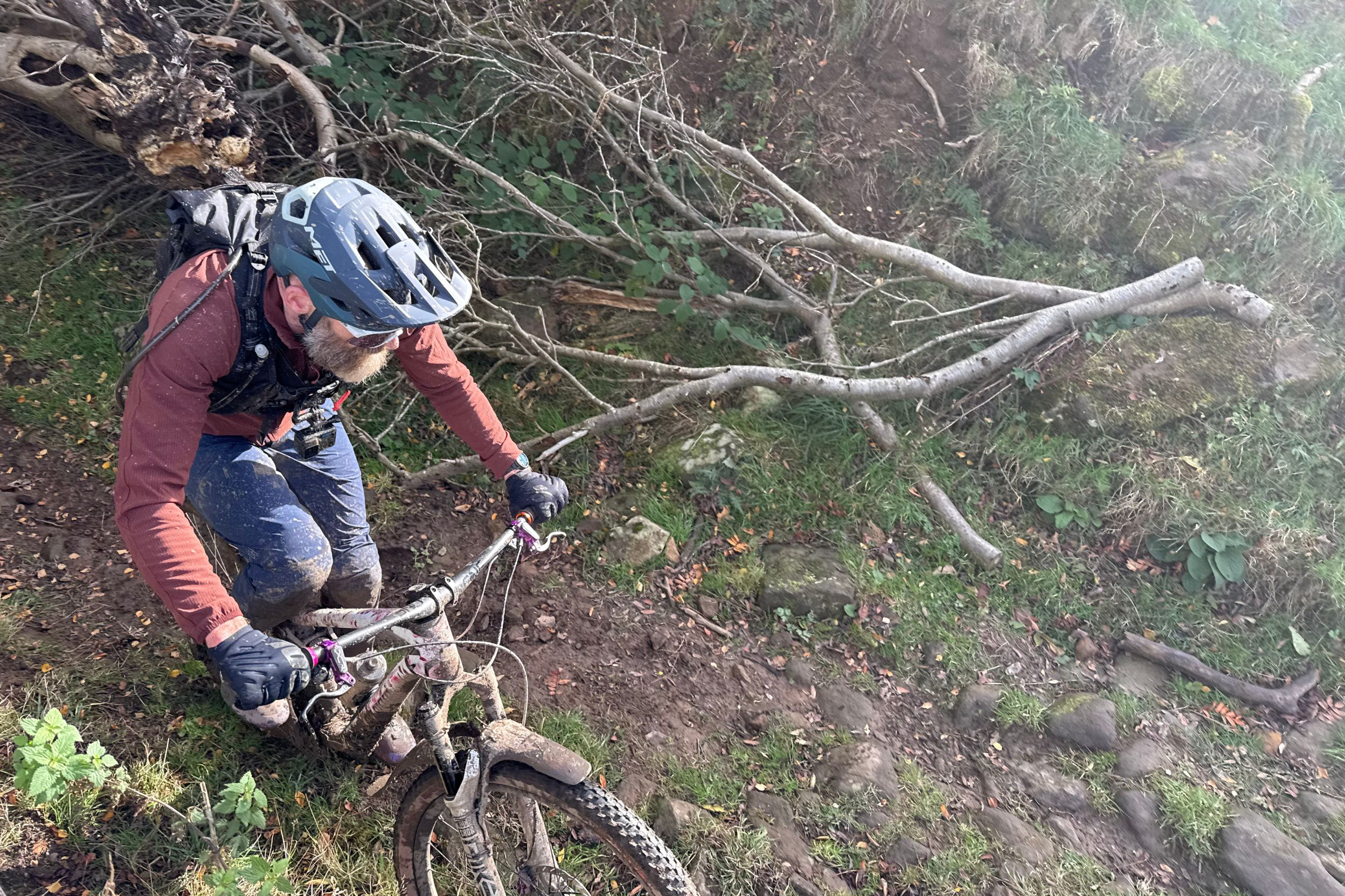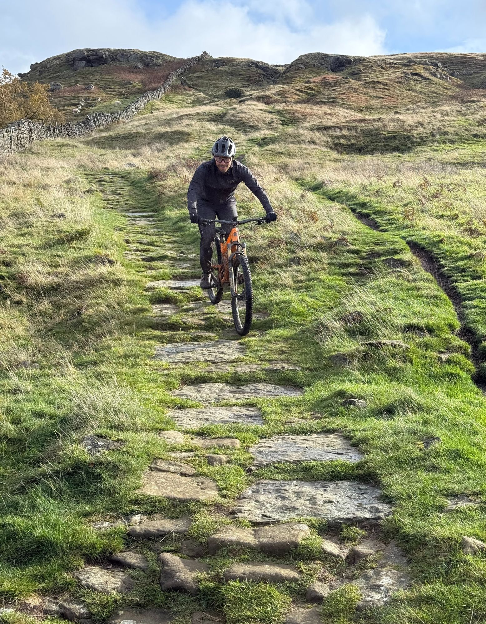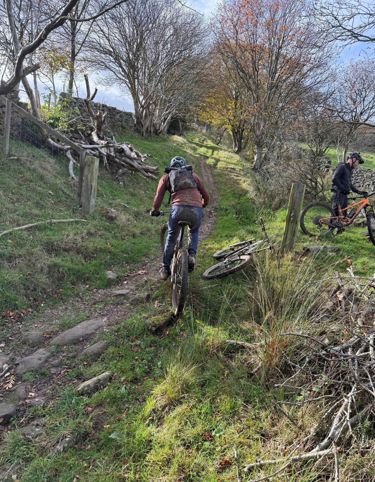 While the old sign suggesting bike and horse riders should dismount has gone, the stone stepped descent off the top of the moor still needs treating with respect. In fact, the combination of tight corners, steep pitches, and sharp rock edge water bars means walking is the wisest option if you’re unsure. Especially as it can be busy with walkers on a weekend. Don’t relax too much after the gate either, as the final cobbled section can be really slippery in the wet, as Neal demonstrated with an unplanned sit down on our recce ride.