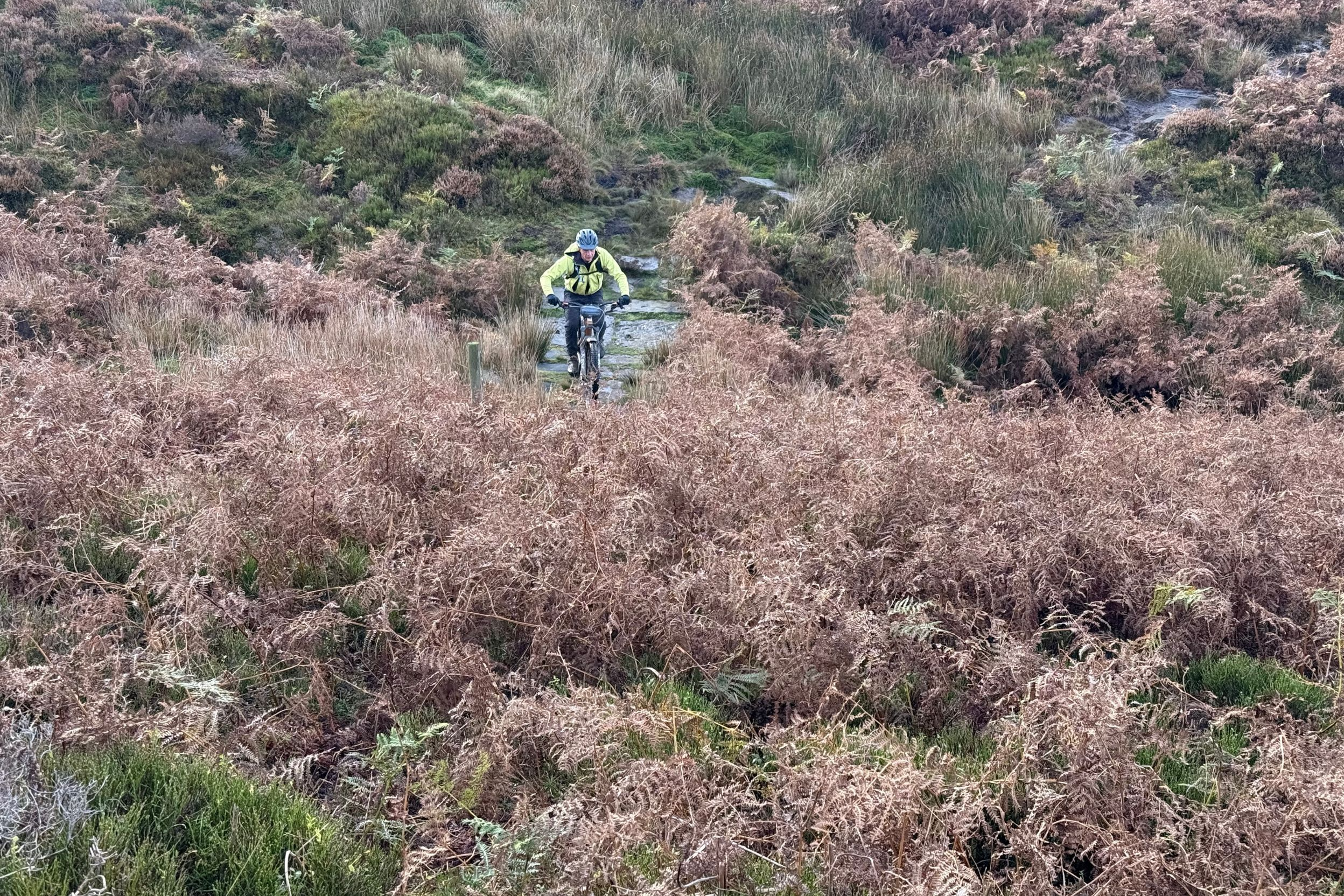 Presuming you survive the rockery, the line shifts out of the trough and swerves onto a singletrack on the left-hand side after a couple hundred metres. The singletrack then snakes left and right across open moorland, gathering speed for as long as you dare stay off the brakes. Be ready to pop the front wheel over a few wet sections if it’s been raining too. This brings you down towards a dry-stone wall coming in from the left, and at this point things get tighter and the singletrack Scalextric slot gets deeper. Expect deep bracken in summer too. This fires you out into a more open section where you need to take one of the lines left, and maybe one of the optional small jumps for a bit of air time, before the field gate.